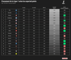 Dans un article consacré aux premiers bilans statistiques des dix-huit clubs de Ligue 1 au tiers du championnat, L’Équipe a créé un classement alternatif basé sur les expected goals. L’objectif : recalculer le score de tous les matches disputés au cours des douze premières journées afin de réattribuer des points en fonction des résultats générés.