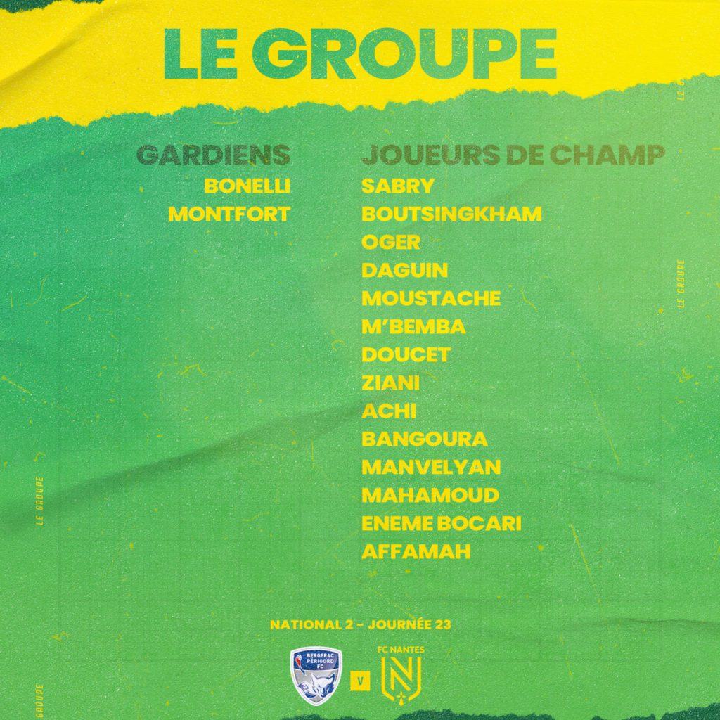 Douze. C’est le nombre de points qui sépare le FC Nantes de Bergerac, premier du groupe D de National 2. Invaincus depuis vingt rencontres, les Bergeracois entendent bien continuer cette belle série devant leur public, à 18h.